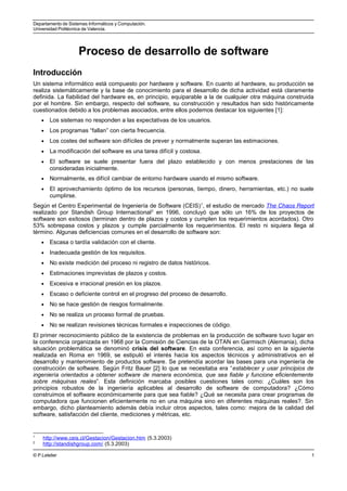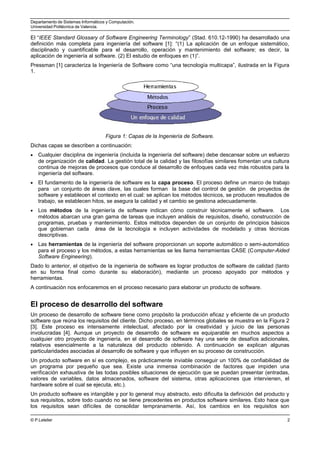 El documento describe los problemas históricos en el desarrollo de software y la necesidad de un proceso sistemático. Explica que un proceso típico de desarrollo de software incluye actividades fundamentales como especificación, diseño, implementación, validación y evolución, así como actividades protectoras como control de proyectos, revisiones y garantía de calidad.