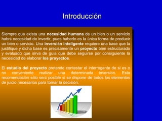 El documento presenta una introducción a la teoría de proyectos. Explica que siempre que exista una necesidad humana de un bien o servicio, será necesaria una inversión para producirlo. Un proyecto bien estructurado y evaluado sirve como guía para dicha inversión. Luego define conceptos clave como proyecto y clasifica los proyectos según su naturaleza y beneficios. Finalmente, describe las cuatro etapas del ciclo de vida de un proyecto: idea, preinversión, inversión u ejecución, y oper