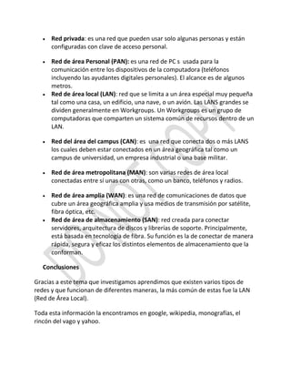 Este documento define una red como un conjunto de equipos conectados por cables, señales u ondas que comparten información y recursos. Describe varios tipos de redes comunes como las redes públicas, privadas, de área personal, de área local, de campus, metropolitana, amplia y de almacenamiento. Concluye que las redes funcionan de diferentes maneras y que la red de área local es la más común.