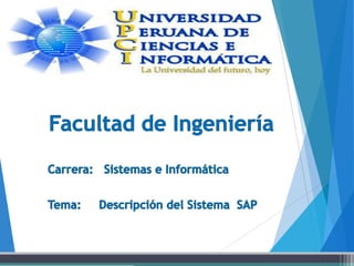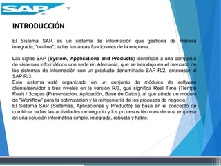 El documento describe el sistema SAP (Systems, Applications and Products), un sistema de información que gestiona de manera integrada todas las áreas funcionales de una empresa. SAP es un software empresarial líder a nivel mundial con más de 100,000 instalaciones. El documento también brinda información sobre la historia, arquitectura y compatibilidad del sistema SAP R/3.