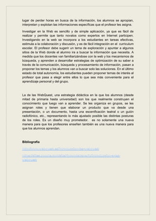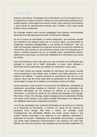 Este documento discute los desafíos y oportunidades de usar Internet como recurso pedagógico. Mientras Internet provee una gran cantidad de información, también hace difícil encontrar información relevante y distinguir entre información de calidad y poca confiable. Los WebQuests son actividades estructuradas que guían a los estudiantes a encontrar y analizar información específica asignada por el profesor, evitando que pierdan tiempo en búsquedas infructuosas. Los WebQuests promueven el aprendizaje colaborativo y la discusión, e integran