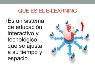 Este documento presenta una introducción al e-learning. Explica que el e-learning es un sistema educativo interactivo y tecnológico que se ajusta al tiempo y espacio del estudiante. Luego describe varios tipos de aprendizaje como el m-learning y u-learning. También presenta cinco mandamientos para estudiantes virtuales como la disciplina y organización. Finalmente, concluye que el curso ayudó a aprender sobre las características del e-learning y su evolución.