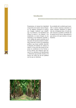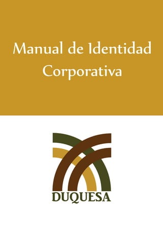 El documento presenta el manual de identidad corporativa de la marca Duquesa. Describe los elementos visuales que componen la imagen de la empresa, como el logotipo, símbolo, colores corporativos y tipografías. También explica las normas para la aplicación correcta de la identidad visual de Duquesa en diferentes soportes de comunicación para mantener la coherencia de la marca.