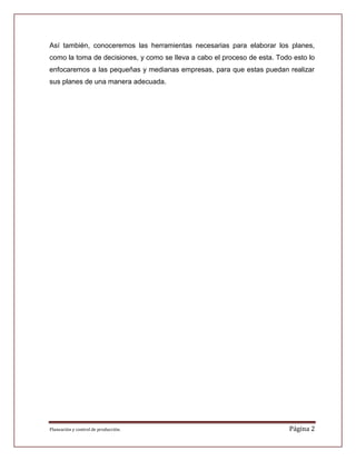 Este documento trata sobre la planeación y el control de producción en las empresas. Explica que la planeación es anticipar las acciones futuras de la empresa para alcanzar sus objetivos de manera efectiva. También describe que el control de producción es verificar que las actividades de la empresa se realicen según lo planeado y corregir desviaciones. El objetivo general es ayudar a las pequeñas y medianas empresas a planear y controlar su producción de forma adecuada para mejorar su desempeño.