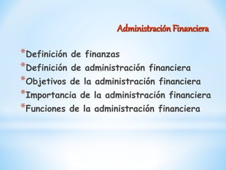 El documento aborda la administración financiera, definiéndola como el arte y la ciencia de gestionar dinero en organizaciones, y destaca su importancia en la maximización del valor empresarial y la toma de decisiones sobre inversiones y financiamiento. También se examinan las funciones del administrador financiero y su impacto en la eficiencia operativa y el desarrollo estratégico de la empresa. Se enfatiza la necesidad de un análisis y evaluación adecuados para guiar la toma de decisiones y mejorar la rentabilidad y sostenibilidad de la organización.