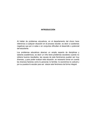 Este documento discute los problemas educativos en el departamento de Chocó, Colombia. Identifica varias causas comunes de problemas educativos como falta de recursos económicos, embarazo juvenil, deserción escolar, falta de interés de los estudiantes y motivación de los maestros. Se enfoca específicamente en analizar los factores que contribuyen a la alta tasa de deserción escolar en la región, la cual es dañina para el desarrollo económico y social. El documento justifica la necesidad de abordar este problema de