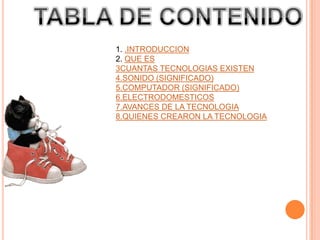 El documento habla sobre tecnología. Explica que la tecnología es el conjunto de conocimientos técnicos que permiten crear bienes y servicios para satisfacer las necesidades humanas. También menciona que la tecnología ha evolucionado a lo largo del tiempo, impulsada por científicos y inventores que buscaban satisfacer necesidades humanas mediante el desarrollo de nuevas técnicas y objetos. Finalmente, resume que la tecnología es creada por el ser humano a través de individuos, empresas y organizaciones con el fin