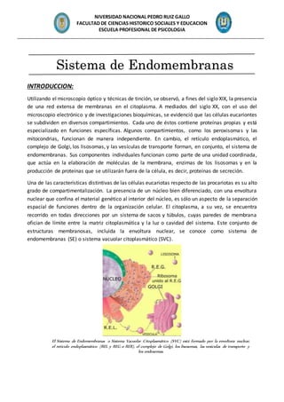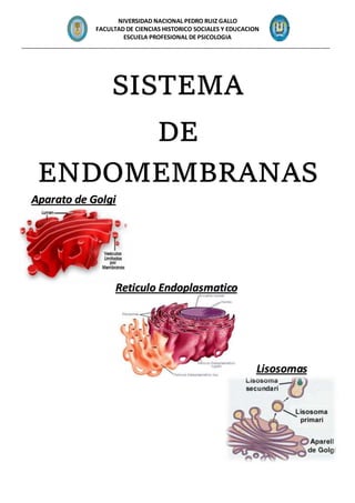 El documento describe el sistema de endomembranas, que incluye la envoltura nuclear, el retículo endoplasmático, el aparato de Golgi, los lisosomas y las vesículas de transporte. Explica que estas estructuras funcionan de forma coordinada en la síntesis y transporte de moléculas como proteínas, lípidos y glúcidos. También describe las funciones y estructuras del retículo endoplasmático y el aparato de Golgi.