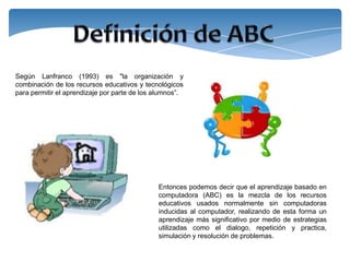 Según el documento, el aprendizaje basado en computadoras (ABC) implica la organización y combinación de recursos educativos y tecnológicos para permitir que los estudiantes aprendan, particularmente a través de estrategias como el diálogo, la repetición y la práctica, la simulación y la resolución de problemas utilizando computadoras. El aprendizaje basado en computadoras puede proporcionar una capacitación flexible, mayor productividad y ahorros en los costos por participante.