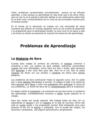 El documento discute la diversidad en el aprendizaje y las necesidades educativas especiales. Argumenta que la educación debe ser inclusiva y atender a las necesidades individuales de cada estudiante. También describe los problemas de aprendizaje como dificultades que afectan procesos como la lectura, escritura y matemáticas, y que pueden ser causados por diferencias en el funcionamiento del cerebro.