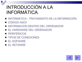 El documento introduce los conceptos básicos de la informática. Explica que la informática se ocupa del tratamiento automático de la información usando computadores, el cual consta de tres fases: entrada, proceso y salida de datos. También describe los componentes principales del hardware como la CPU, memoria y periféricos, así como los tipos de software y redes informáticas.