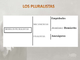 Los primeros filósofos presocráticos, conocidos como monistas, consideraban que una única sustancia es el principio de todas las cosas, como el agua, el aire o el fuego. Posteriormente surgen las escuelas pitagórica, que ve en los números la sustancia de las cosas, y la eleática, que defiende la inmutabilidad del ser. Heráclito introduce el cambio perpetuo y la lucha de contrarios. Empédocles y Anaxágoras proponen múltiples elementos materiales. Demócrito establece un modelo ató
