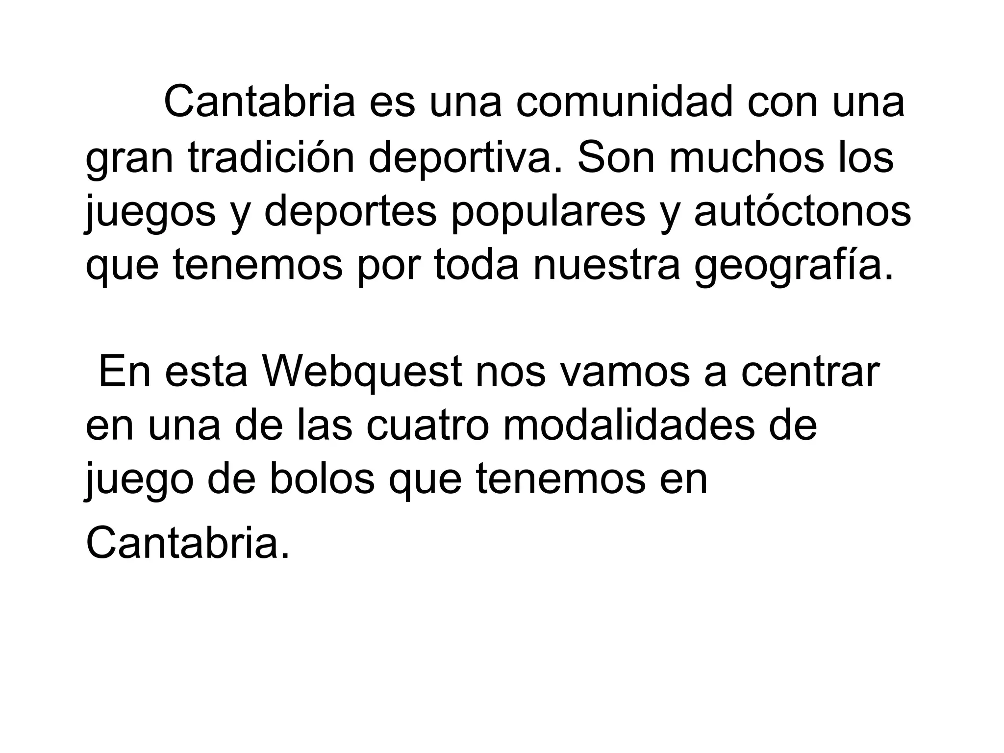 Cantabria tiene una gran tradición deportiva con muchos juegos y deportes populares y autóctonos en toda su geografía. Esta Webquest se centrará en una de las cuatro modalidades de juego de bolos que existen en Cantabria.