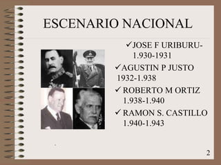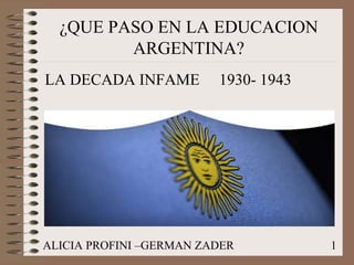 Durante la década infame de 1930-1943 en Argentina, hubo varios presidentes y proyectos educativos notables. Se propuso "espiritualizar y argentinizar" la educación con un enfoque espiritualista a través de la Ley 1420 y la Reforma Universitaria, con el objetivo de que la escuela promueva un sentido nacional y los estudiantes sean protagonistas de su propio aprendizaje.