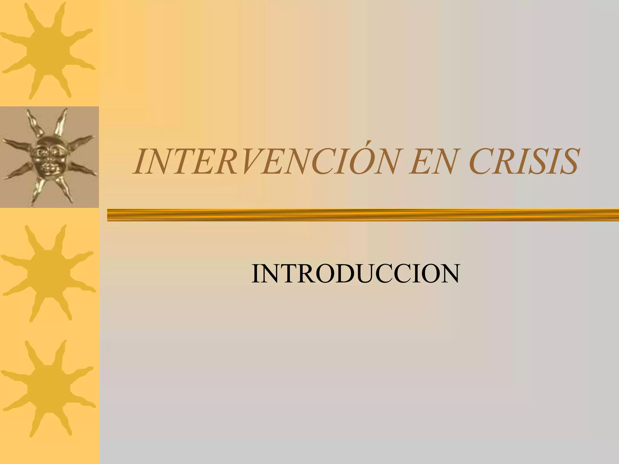 La intervención en crisis tiene como objetivo ayudar a las personas a sobrellevar eventos traumáticos para reducir los efectos negativos y aumentar el crecimiento personal. Surge en la década de 1940 para brindar apoyo a las víctimas de desastres. Aunque inicialmente se enfocó en la prevención, ahora promueve el enriquecimiento a través del desarrollo de habilidades para manejar crisis de manera constructiva.