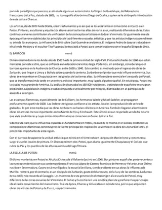 Este documento resume la historia del arte en la región de Charcas (actual Bolivia) desde el siglo XVI hasta principios del siglo XVIII. Comienza describiendo la influencia del manierismo italiano en la pintura, traído por artistas como Bitti, y su impacto en las escuelas artísticas indígenas. Luego describe la llegada del barroco con influencias de Zurbarán y grabados flamencos, y el surgimiento de las escuelas de Potosí y del Collao. Finalmente, se enfoca en la escuela de Potosí y su principal