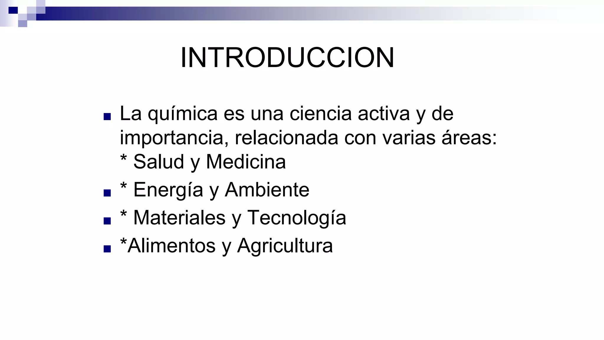 La química es una ciencia relacionada con la salud, la energía, el medio ambiente, los materiales y la agricultura. Utiliza el método científico para estudiar las sustancias, su estructura, composición y transformaciones. La química examina la materia, que se define como cualquier cosa que tiene masa y ocupa espacio.