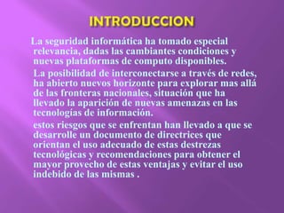 Este documento presenta las políticas de seguridad informática de la Municipalidad Provincial de Tumbes. Establece la confidencialidad, integridad y disponibilidad de la información, así como las responsabilidades del personal de TI. También prohíbe actividades como la distribución de software pirata o malware en las redes, y establece directrices para el uso adecuado de recursos compartidos y correo electrónico.