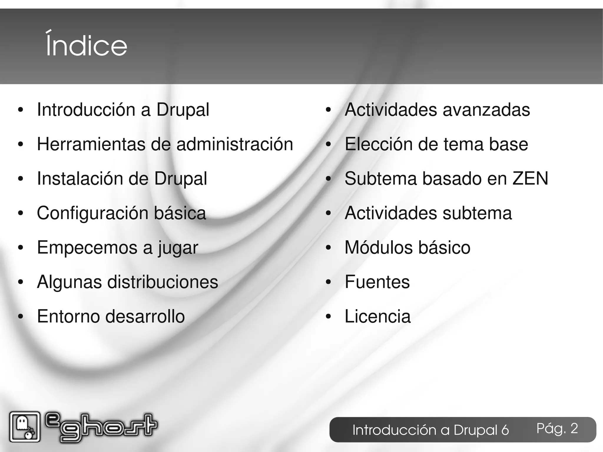 El documento es una introducción a Drupal 6, un sistema de gestión de contenidos libre y modular, que permite la creación y gestión de diversos tipos de sitios web. Se abordan aspectos clave como su instalación, configuraciones, características, y las herramientas necesarias para su administración, así como las libertades garantizadas por su licencia GPL. Además, se mencionan sus fortalezas y debilidades, junto con ejemplos de uso en diferentes sectores.