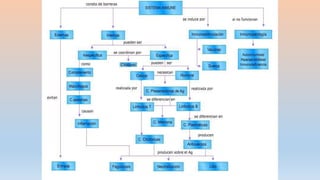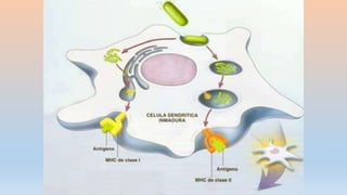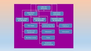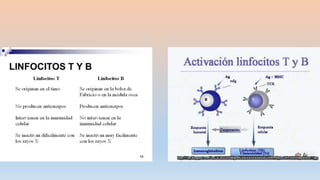 Este documento trata sobre la inmunología básica e inmunodeficiencias. Explica las diferencias entre la inmunidad innata y adaptativa, los tipos de células y órganos que componen el sistema inmunológico, como los linfocitos B y T, y los anticuerpos e isótipos. También describe brevemente la historia de la inmunología y algunos conceptos clave como la memoria inmunológica.