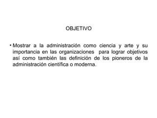 Este documento presenta los conceptos clave de la administración como ciencia y arte según los pensadores clásicos. Explica que la administración debe estudiarse científicamente para reemplazar el empirismo con técnicas efectivas. Luego resume los 14 principios de la administración de Fayol y los 4 principios fundamentales para la tarea del obrero de Taylor. Finalmente, describe la estructura organizacional jerárquica propuesta por la teoría clásica.
