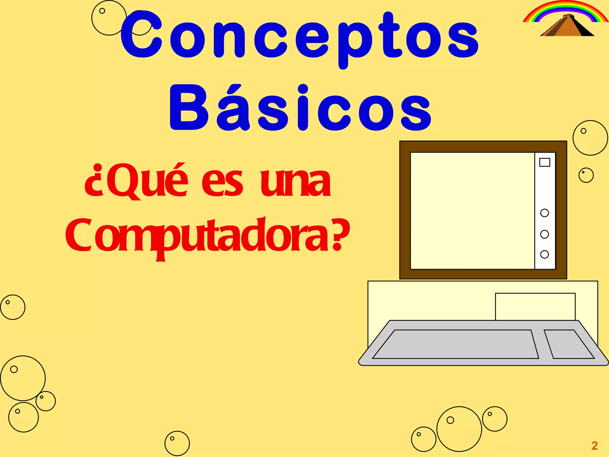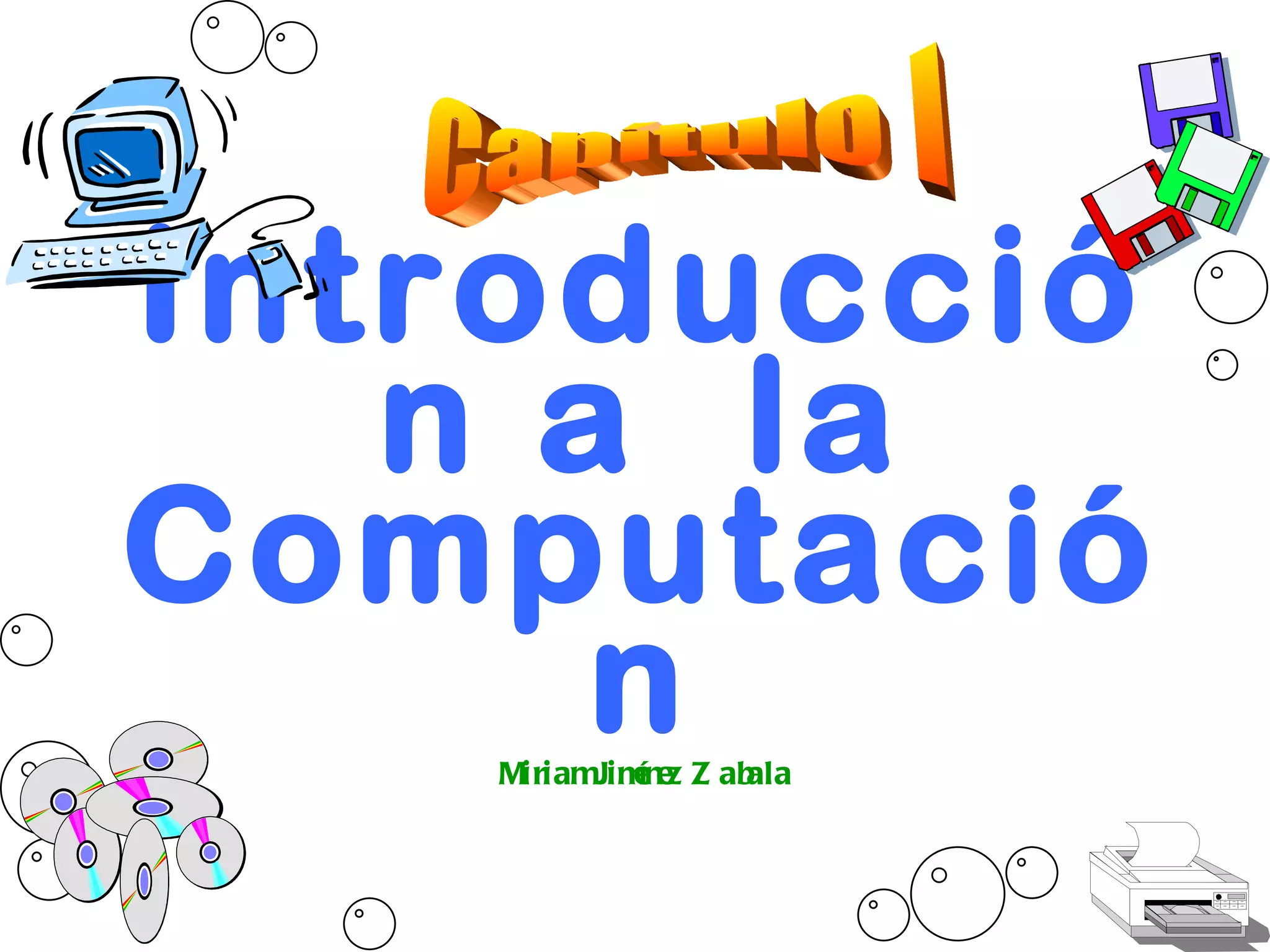 Una computadora es un mecanismo electrónico que acepta información de entrada, la procesa y produce información de salida. El hardware se compone de dispositivos de entrada, salida, memoria y el procesador, mientras que el software son los programas ejecutados en el hardware. Algunos dispositivos de entrada incluyen teclados, mouse y escáneres, mientras que los dispositivos de salida son monitores, impresoras y modems. La memoria incluye RAM, discos duros y ópticos.
