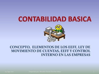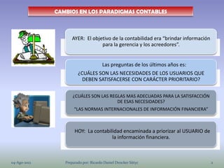 El documento aborda la evolución de la contabilidad, enfatizando la importancia de satisfacer las necesidades de los usuarios de información financiera a través de normas internacionales. Se describen elementos de estados financieros y la ley de movimiento de cuentas, así como la naturaleza del control interno en las empresas, orientado a limitar riesgos y cumplir objetivos institucionales. Además, se mencionan las características cualitativas de la información y los grupos de usuarios que dependen de ella.