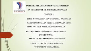 Este documento introduce conceptos básicos de estadística descriptiva como medidas de tendencia central (media, mediana y moda) y tipos de variables (cuantitativas y cualitativas). Explica que la estadística descriptiva describe y analiza datos sin inferir conclusiones sobre la población. También define términos como individuo, población y muestra. Luego procede a definir la media, mediana y moda y dar ejemplos de cómo calcular cada una.