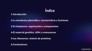 El documento describe la estructura y función de la célula, destacando la membrana plasmática, el citoplasma, el material genético (ADN y cromosomas), y los ribosomas. Se explica que las células están compuestas de dos tipos principales: procariotas y eucariotas, siendo estas últimas más complejas y conteniendo su material genético en el núcleo. Además, se detalla que los ribosomas son esenciales para la síntesis de proteínas, garantizando así las funciones vitales de la célula.