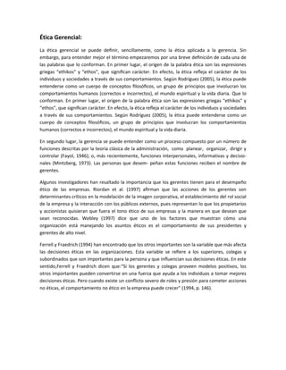 Este documento presenta una introducción a la ética y la ética gerencial. Explica que la ética surgió en la antigüedad cuando los filósofos intentaron organizar la sociedad y establecer normas para lograr armonía. También describe que la ética se aplica en diversos campos como la bioética y la ética empresarial. Finalmente, define la ética gerencial como la aplicación de la ética a la gerencia y presenta cinco principios que guían la conducta ética de los gerentes: propósito, orgullo, paciencia,