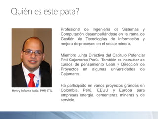 Este documento presenta una introducción a la dirección de proyectos desde la perspectiva de Henry Infante, un profesional de ingeniería y gerente de proyectos. Infante define un proyecto, la gestión de proyectos y los componentes clave como el alcance, el tiempo y los recursos. Explica los desafíos de dirigir proyectos en la vida real, incluidas las limitaciones de la organización, el equipo y el gerente de proyectos. Concluye que Cajamarca necesita mejorar la práctica formal de la dirección de pro