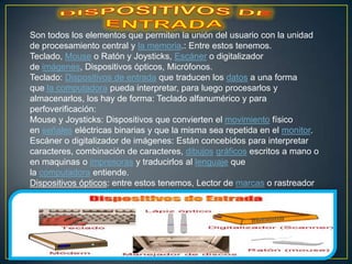 La informática se define como la automatización del manejo de la información. Aunque la tecnología se ha expandido rápidamente, el público general solo tiene conocimientos superficiales. Es importante perder el miedo a la tecnología para entender lo útil que es en la vida diaria. El documento luego describe los componentes básicos del hardware, incluyendo dispositivos de entrada, salida, procesamiento y almacenamiento, y explica brevemente cada uno.