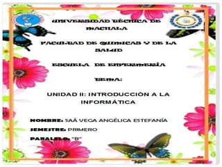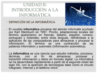 Este documento introduce el tema de la informática. Define la informática como la ciencia que estudia métodos para almacenar, procesar y transmitir información digitalmente. Explica que la informática se ha desarrollado rápidamente desde la segunda mitad del siglo XX con tecnologías como los circuitos integrados, Internet y los teléfonos móviles. Distingue la informática de la computación, señalando que la informática se enfoca en el software y hardware mientras que la computación estudia sistemas automatizados de manejo de información. Finalmente,