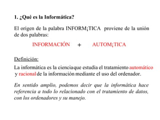 El documento introduce los conceptos básicos de informática, incluyendo la definición de informática como el tratamiento automático de la información mediante ordenadores. Explica que los datos se procesan en tres fases: entrada, proceso y salida, y que los programas indican al ordenador qué acciones realizar. También describe la representación binaria de datos y caracteres usando ceros y unos, y las unidades de medida como bit, byte, kilobyte y más.