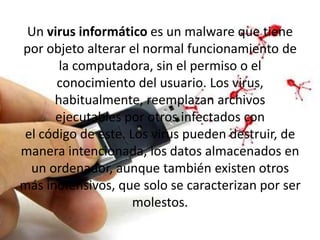Un virus informático es un programa malicioso que se propaga a sí mismo y altera el funcionamiento normal de una computadora sin el permiso del usuario. Los virus pueden destruir datos de manera intencional o simplemente ser molestos. Se originaron en los años 70 y desde entonces han proliferado, propagándose a través de disquetes, correos electrónicos y más. Existen diversos tipos como troyanos, gusanos, hoaxes y bombas lógicas o de tiempo, cada uno con características particulares.