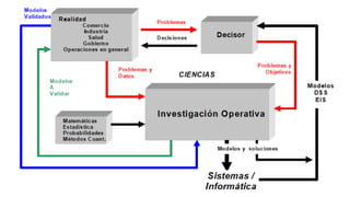 El documento aborda la investigación operativa, destacando varios tipos de modelos utilizados para representar problemas del mundo real, incluyendo modelos físicos, descriptivos, analógicos y simbólicos. Se explica cómo resolver problemas a través de la programación lineal, que implica la formulación y solución de modelos matemáticos, y se discuten las variables de decisión, funciones objetivo y restricciones. Además, se presenta un ejemplo práctico relacionado con la producción de tejidos para ilustrar la aplicación de estos conceptos en la optimización de recursos.