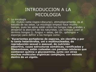Este documento introduce la micología, el estudio de los hongos. Explica que los hongos son eucariontes sin clorofila que se reproducen sexual o asexualmente. Discuten la importancia de los hongos en la fermentación, producción de antibióticos y enzimas, y como agentes patógenos. También describe la morfología de los hongos filamentosos y levaduriformes, y la clasificación actual de los reinos de hongos. Finalmente, cubre las micosis cutáneas y sistémicas, incluy