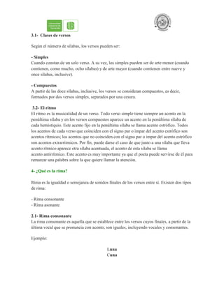 El documento presenta una introducción a conceptos básicos de poesía como poemas, estrofas, versos, rima y análisis poético. Define los poemas como obras escritas en verso que buscan expresar emociones. Explica que las estrofas son conjuntos de versos con la misma forma métrica y estructura. Los versos son las divisiones del poema y pueden ser simples o compuestos dependiendo del número de sílabas. Finalmente, introduce la rima como igualdad de sonidos finales de los versos, pudiendo ser consonante u