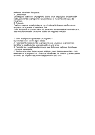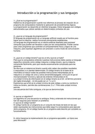 La programación es el proceso de crear programas de computadora mediante lenguajes de programación, que son códigos estructurados que permiten a las máquinas realizar funciones específicas. Los lenguajes de programación expresan algoritmos de manera precisa para ser ejecutados por las computadoras. El código binario es el lenguaje fundamental de las computadoras, compuesto de ceros y unos, mientras que un algoritmo es una secuencia de instrucciones para resolver un problema.