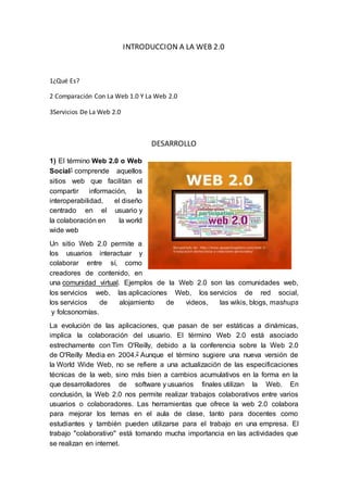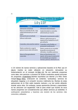 La Web 2.0 permite a los usuarios interactuar y colaborar como creadores de contenido en comunidades virtuales, a través de servicios como redes sociales, wikis y blogs. A diferencia de la Web 1.0 que era estática, la Web 2.0 es dinámica y se enfoca en la colaboración entre usuarios. Nuevos servicios como blogs, wikis y etiquetado de contenido demuestran los principios de la Web 2.0 al permitir que los usuarios construyan contenido usando estándares abiertos y compartan recursos multimedia.