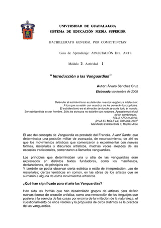 Este documento introduce el concepto de vanguardia en el arte, definido como movimientos artísticos experimentales que exploran nuevas formas alejadas de las escuelas tradicionales. Explica que las vanguardias expresaban sus principios a través de manifiestos y declaraciones. Aunque ya no existan como movimientos, las vanguardias siguen influyendo en el arte actual y fueron formas para desarrollar nuevos lenguajes artísticos que cuestionaran valores establecidos. Cada vanguardia encontró su propia expresión en ismos como el cub