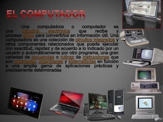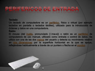 Este documento describe varios dispositivos periféricos de computadora, incluyendo escáneres, cámaras digitales, lectores de código de barras, lápices ópticos, palancas de mando, monitores, impresoras, altavoces, auriculares, multimedia, plotters, faxes y cañones de datos. Explica que estos dispositivos son indispensables para que los usuarios se comuniquen con las computadoras y realicen sus tareas de manera más rápida y cómoda.