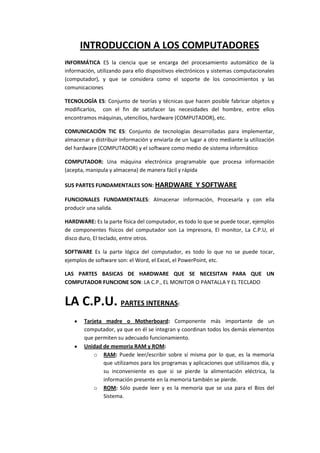 La informática es la ciencia que se ocupa del procesamiento automático de la información a través de dispositivos electrónicos, incluyendo hardware y software. Un computador, que es una máquina electrónica programable, consta de componentes físicos como la CPU, monitor y teclado, y partes lógicas como sistemas operativos y aplicaciones. La tecnología de la información y comunicación (TIC) facilita la gestión y transmisión de datos mediante estas herramientas.