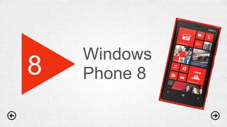 El documento presenta una introducción exhaustiva a Windows Phone 8 y Windows 8, incluyendo su historia, herramientas de desarrollo, nuevas características y mejoras en el SDK. Se detallan herramientas como Visual Studio 2012 y emuladores para desarrollar aplicaciones, así como innovaciones en la interfaz de usuario y funcionalidades como reconocimiento de voz y mapas avanzados. También se abordan oportunidades y modelos de negocio para aplicaciones en la Windows Store.