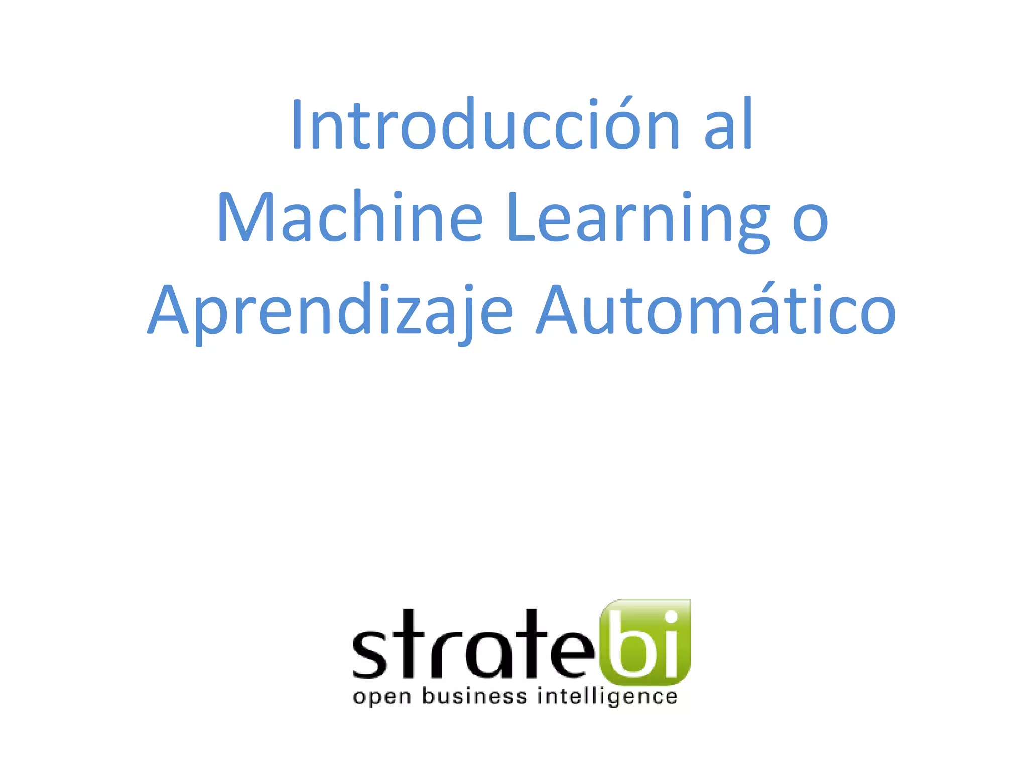 Este documento presenta una introducción al machine learning o aprendizaje automático. Explica que es un campo de la inteligencia artificial que trata de construir sistemas que aprenden de los datos. Describe las principales técnicas de machine learning como clasificación, clustering y regresión. También menciona algunos casos de uso como detección de spam, traducción automática y recomendaciones.