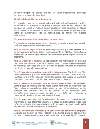 Este documento introduce los modelos de programación lineal. Explica que la investigación de operaciones usa modelos matemáticos para encontrar soluciones óptimas a problemas empresariales asignando recursos de manera eficiente. Los modelos pueden ser estáticos o dinámicos, lineales o no lineales, enteros o no enteros, y determinísticos o estocásticos. También describe el proceso de siete pasos para construir y aplicar modelos matemáticos para resolver problemas empresariales de manera científica.