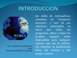 El documento habla sobre las redes de ordenadores y sus objetivos de compartir recursos sin importar la ubicación física. Explica que un enrutador es un dispositivo que conecta redes y determina la ruta de los paquetes de datos. Luego describe diferentes tipologías de redes como bus, estrella, anillo, doble anillo, malla y árbol. También distingue entre redes de área local, metropolitana y amplia. Finalmente, define una red inalámbrica y señala que elimina cables pero requiere mayor segur