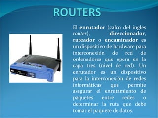 Las redes de ordenadores permiten compartir recursos como programas, datos y equipos entre usuarios sin importar su ubicación física. Un enrutador es un dispositivo de hardware que conecta redes y determina la ruta que debe tomar un paquete de datos entre ellas. Existen diferentes topologías de red como bus, estrella, anillo y malla que determinan cómo se conectan los nodos entre sí.