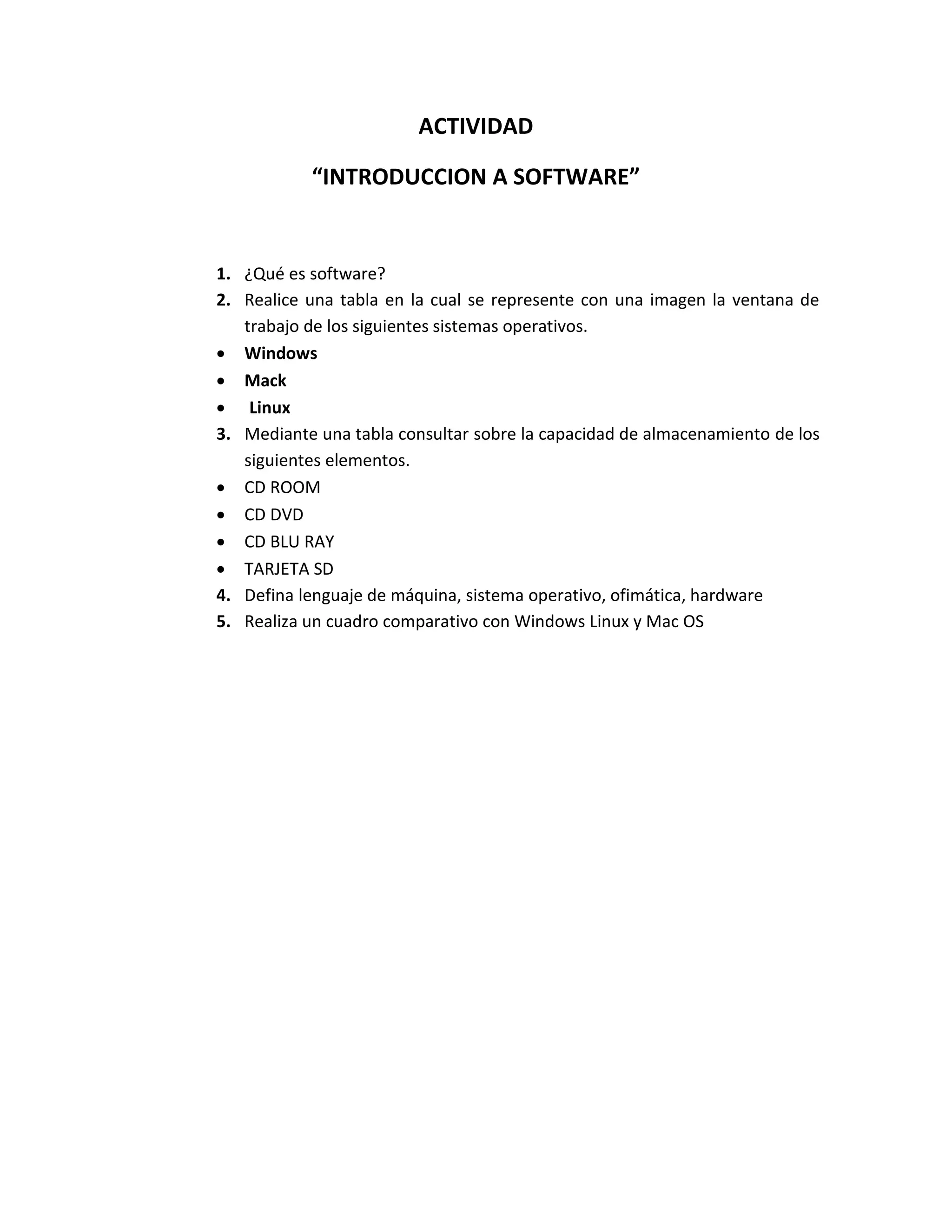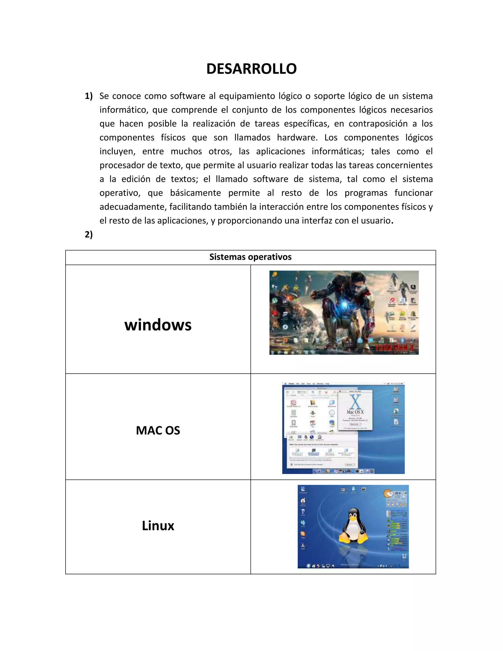 El documento introduce el concepto de software y realiza una comparación entre los sistemas operativos Windows, Mac OS y Linux. Explica que el software son los componentes lógicos de un sistema informático como aplicaciones y el sistema operativo, mientras que el hardware son las partes físicas. Incluye tablas sobre las capacidades de almacenamiento de diferentes dispositivos y las características de los tres sistemas operativos en términos de costo, complejidad y plataformas compatibles.