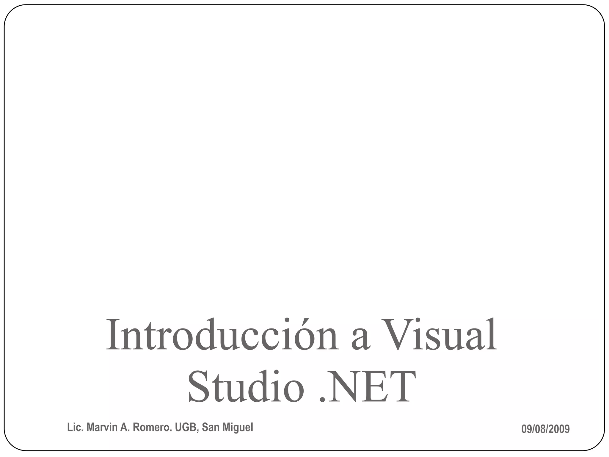 El documento introduce Visual Studio .NET, incluyendo conceptos básicos de .NET y cómo usar Visual Studio .NET para crear un proyecto de Visual Basic .NET. Explica cómo crear el interfaz de usuario, establecer propiedades, agregar código, probar y depurar, y generar e implementar una aplicación.